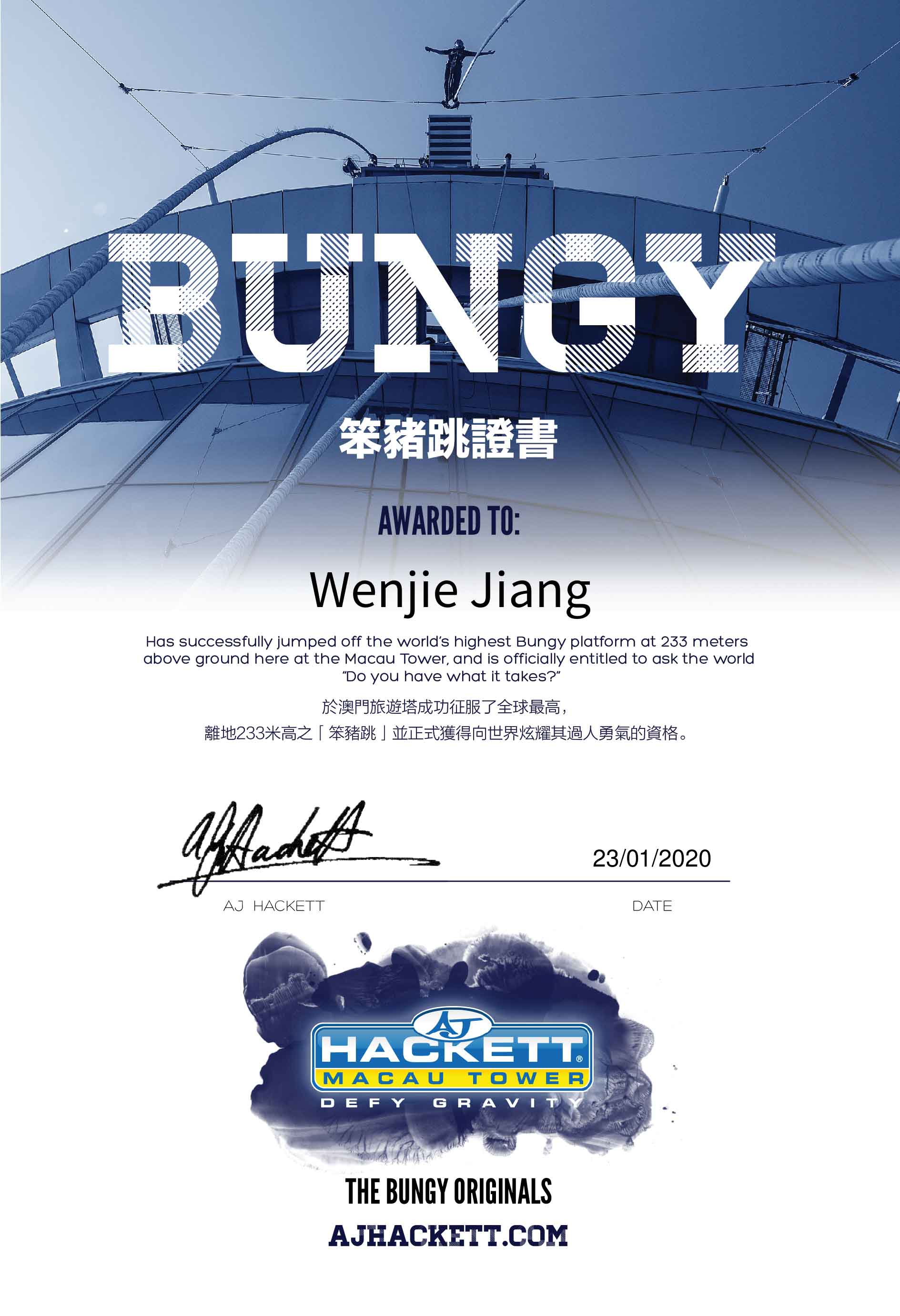 At Macau tower I received this certification of BUNGY JUMP, which is a fantastic experience.